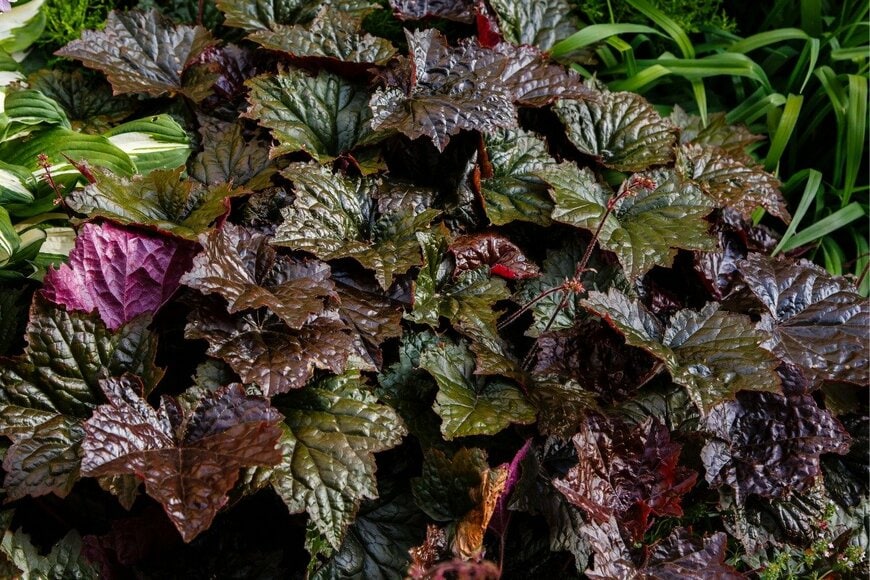 ハボタンのカラーは濃いパープルやブラックカラーがおすすめ。定番リーフプランツのヒューケラの葉色は同系色にして、アクセントが欲しいときはシルバーリーフプランツを追加するとよいでしょう。