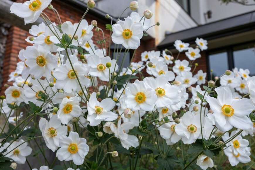 秋に可愛らしい花が開花するシュウメイギク。細い茎の先に咲くホワイトやピンクの花は、秋ガーデンのメインにもなるほど存在感があります。