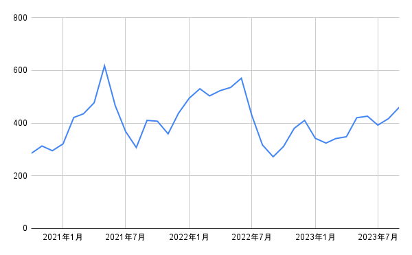 なお、全都市の小売価格の平均は406円(2023年9月時点)、前年同月比では8%の伸びとなっています(いずれも小数点第一位を四捨五入)。