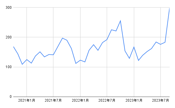 なお、全都市の小売価格の平均は264円(2023年9月時点)、前年同月比では6%の伸びとなっています(いずれも小数点第一位を四捨五入)。