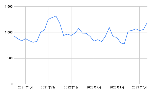 なお、全都市の小売価格の平均は935円(2023年9月時点)、前年同月比では10%の伸びとなっています(いずれも小数点第一位を四捨五入)。