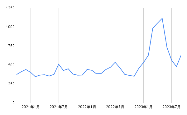 なお、全都市の小売価格の平均は513円(2023年9月時点)、前年同月比では12%の伸びとなっています(いずれも小数点第一位を四捨五入)。