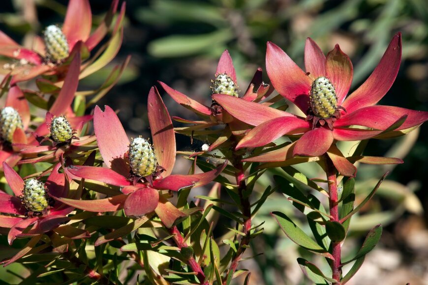 リューカデンドロンはオシャレなオージープランツ。枝先に独特の花が咲きますが、蕾の状態から楽しみます。コニファーなどとも相性が良く、個性的な雰囲気になります。