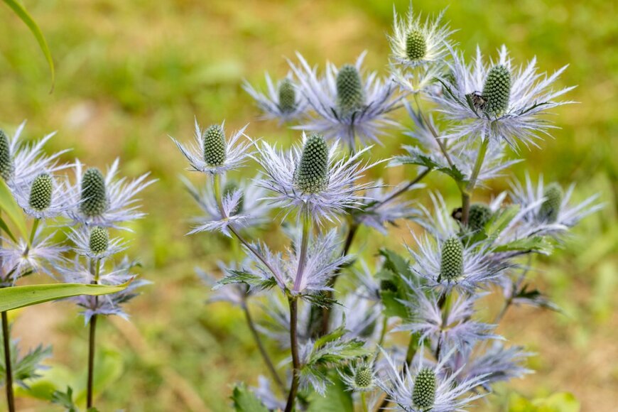 エリンジウムはアザミのようにトゲトゲした苞を持つユニークな植物。花の色はブルーやパープルが多く、メタリックな雰囲気も感じられます。都会的でクールなテイストが好みの方は加えてみるのもおすすめです。
