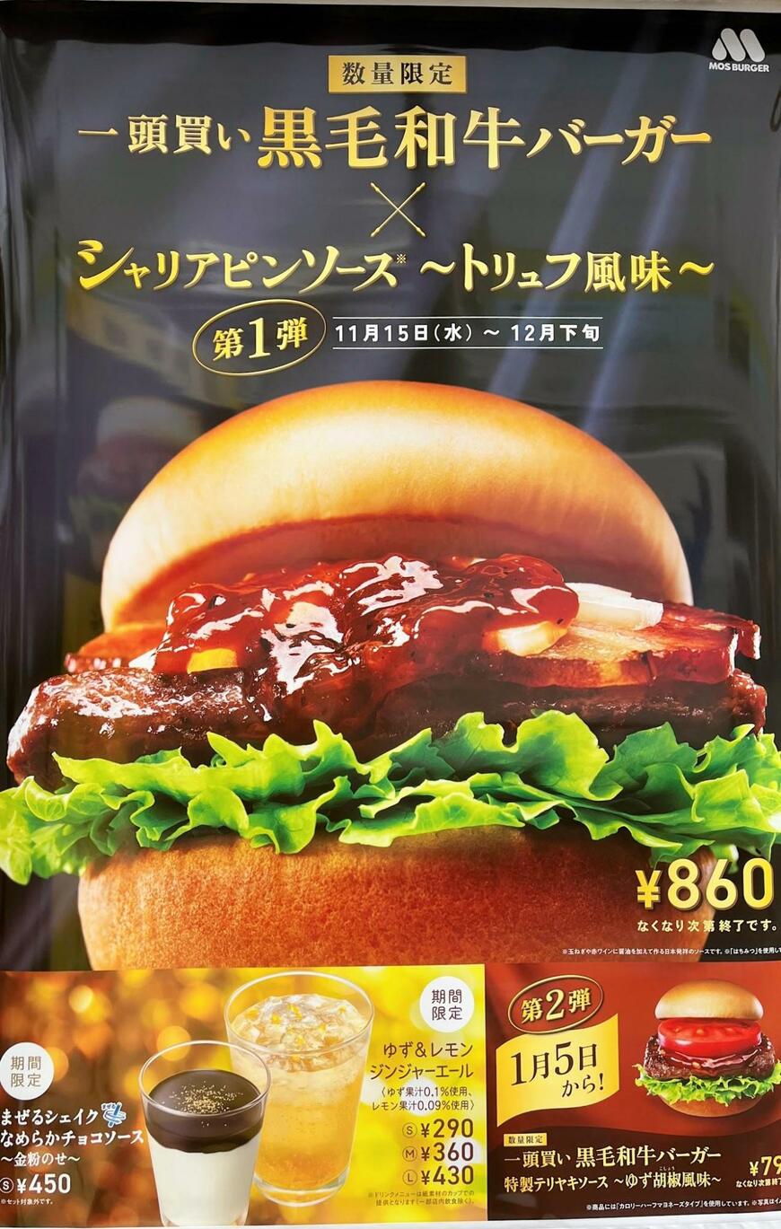 ハンバーガーチェーン・モスバーガーでは、2023年11月15日より「一頭買い黒毛和牛バーガーシャリアピンソース 〜トリュフ風味〜」が期間限定販売されています。