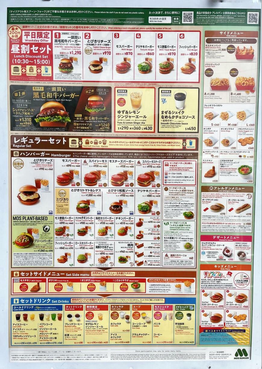 やはり国産黒毛和牛を使用したバーガーというだけあって、モスバーガーの中でも少々リッチなお値段です。平日であれば、ランチタイムにセットメニューがお安くなる昼割セットもいいですね。シャリアピンソースとポテトの相性もいいので、ぜひ一度注文してほしいセットメニューです。