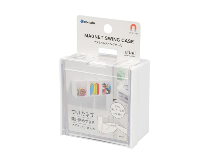 冷蔵庫や玄関のドアなどにマグネットで取り付けできる収納ケースです。クリアケースなので中身が分かりやすく、スイングタイプのポケットでサッと取り出せます。