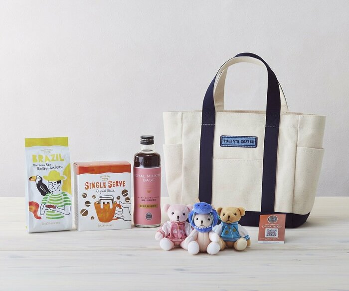 - セット内容:ベアフルクッション&ブランケット(ミルクティー)、エチオピア カッファ セレモニー(豆/140g)、タンザニア GDM農園 ウォッシュド(豆/140g)、グァテマラ エル ポルベニール(豆/140g)、ロイヤルミルクティーベース 300ml、タリーズハニー 300g、干支ミニテディ(辰年)※3種のうちいずれか1個、デジタルドリンクチケット10枚分(有効期限2024年6月12日(水))