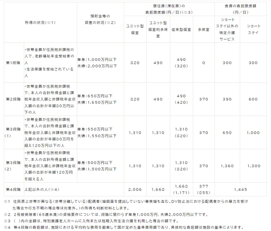 以下の表のように、負担限度額認定は、対象となる人の所得状況によって負担段階が区分され、区分ごとに負担限度額(施設に支払う1日当たりの金額)が決められています(【図表2】参照)。
