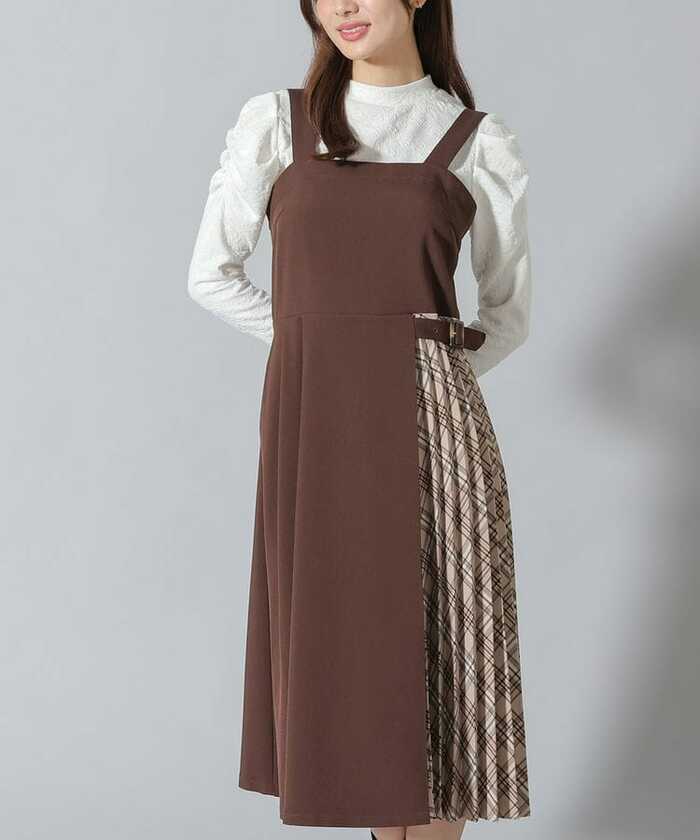 歩くたびにサイドのプリーツが揺れて、まわりの目を惹くワンピース。Tシャツやブラウスなどインナー次第でカジュアルにもフェミニンにも着こなせますよ。ストレッチがきいた素材、かつ後ろにゴムがはいっているので、着心地が楽なのも高ポイントです。スカート部分には裏地がついており、透け感も気になりません。