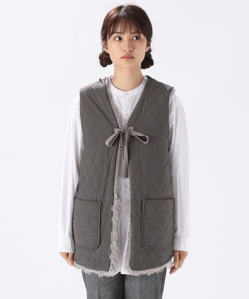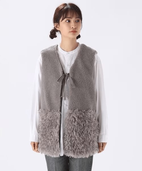 一面はファータイプ、もう一面はボアとファーが2段になっているベストは、秋口から春先まで長い期間使えるアイテム。ファーは、毛足が長すぎないため、スッキリと見えるのがポイントです。リバーシブルなので、他のアイテムとも合わせやすく、羽織るだけで一気に垢抜けます。