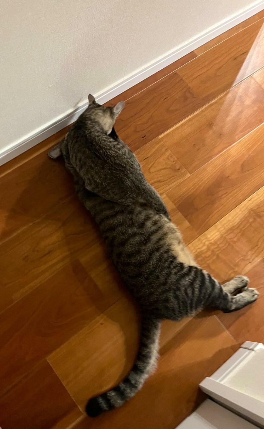そこに写っているのは、フローリングの上に横たわる、キジトラ柄の1匹の猫ちゃん……と思いきや、2匹の猫ちゃんが写っていました。床の上に寝そべる「つむぎくん」の上に、同じキジトラ柄の「ふうか」ちゃんが乗っています。