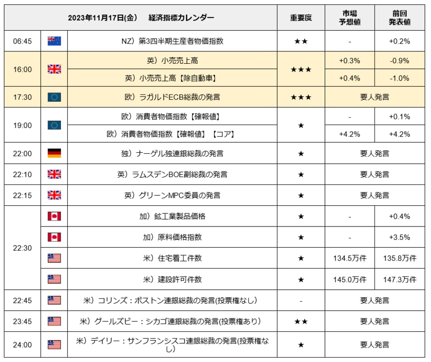 2023年11月17日(金)発表予定の経済指標カレンダーです。