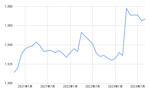 なお、全都市の価格の平均は1213円(2023年9月時点)、前年同月比では0%の伸びとなっています(いずれも小数点第一位を四捨五入)。
