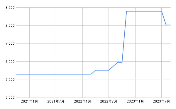 なお、全都市の価格の平均は8384円(2023年9月時点)、前年同月比では▲4%となっています(いずれも小数点第一位を四捨五入)。