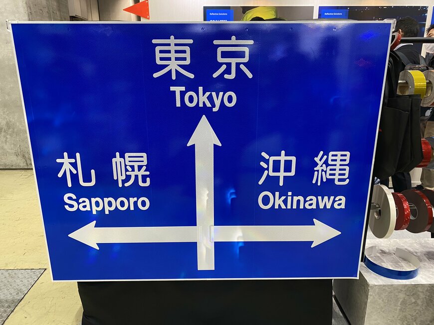投稿主さんにこちらの標識について伺ってみると、「11月中旬に東京ビックサイトで行われた、高速道路の新技術を伝えるための技術展『ハイウェイテクノフェア』で展示されていたものです。出展メーカーが来場者に標識の反射具合などを分かりやすく伝えるために制作した、実物大の架空の標識です」と教えてくれました。