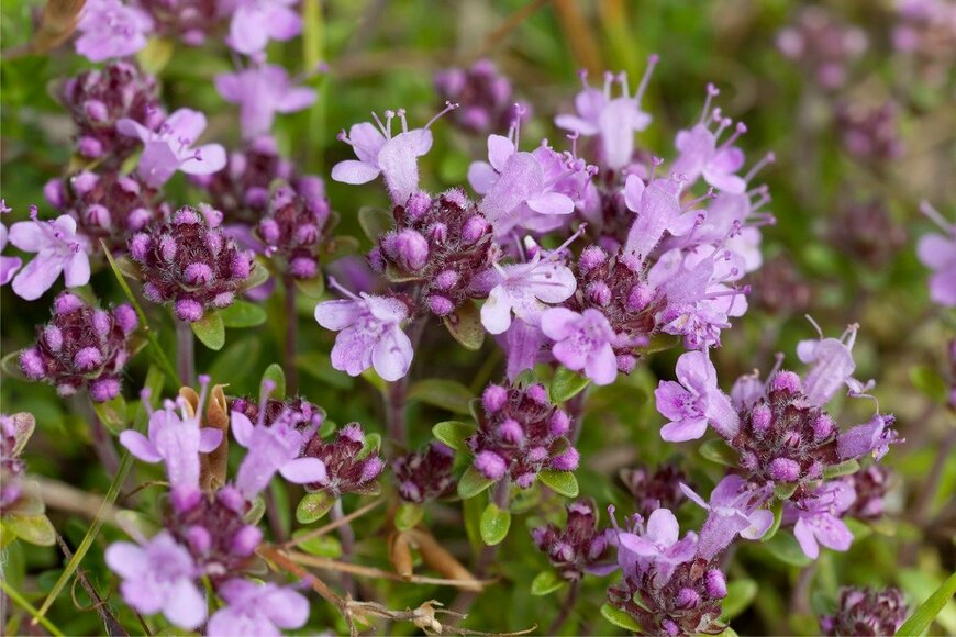 クリーピングタイムはピンクの可愛らしい小花が一面に咲くハーブ。爽やかな香りも楽しめ、植えっぱなしでも育ちます。