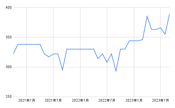 なお、全都市の小売価格の平均は378円(2023年9月時点)、前年同月比では13%の伸びとなっています(いずれも小数点第一位を四捨五入)。