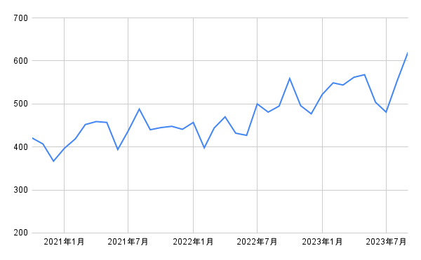 なお、全都市の小売価格の平均は476円(2023年9月時点)、前年同月比では▲5%となっています(いずれも小数点第一位を四捨五入)。