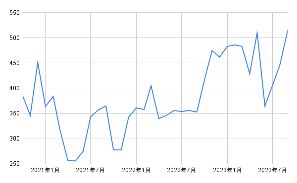 なお、全都市の小売価格の平均は502円(2023年9月時点)、前年同月比では+7%となっています(いずれも小数点第一位を四捨五入)。