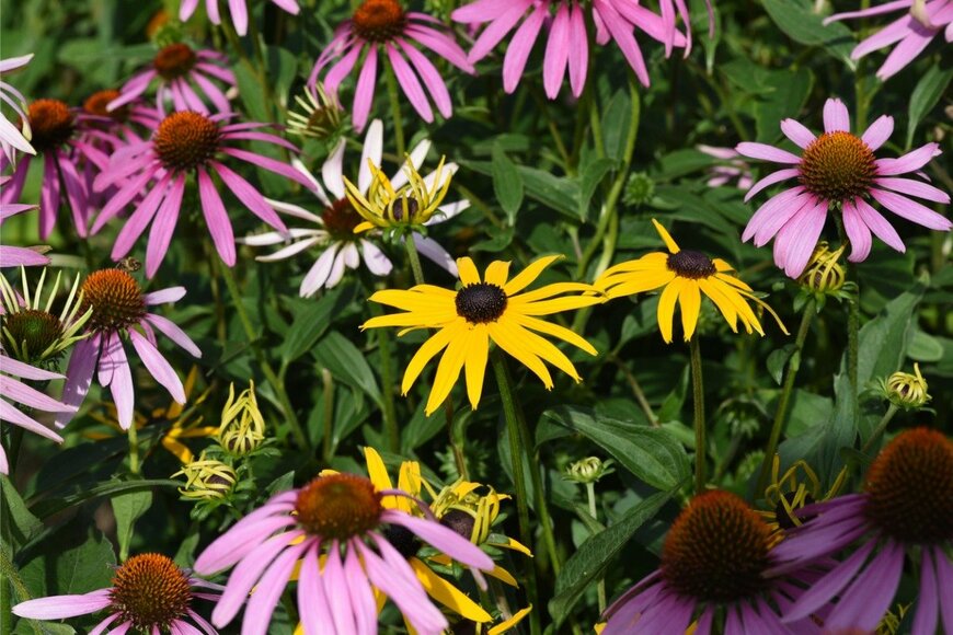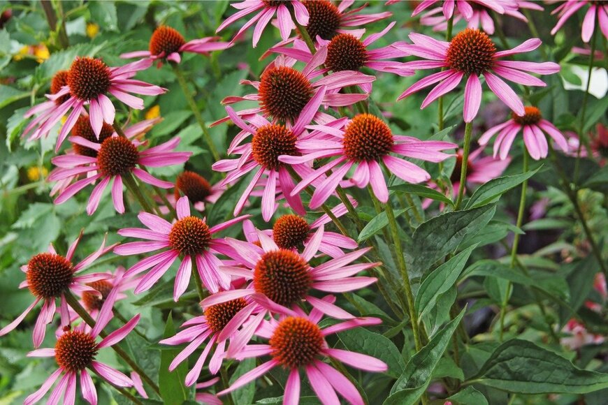 エキナセアは、まるで傘のような花がユニークな多年草。中心部がイガグリのように盛り上がっており、花壇や鉢植えのアクセントにもおすすめです。品種によっては素朴でナチュラルな雰囲気も楽しめます。