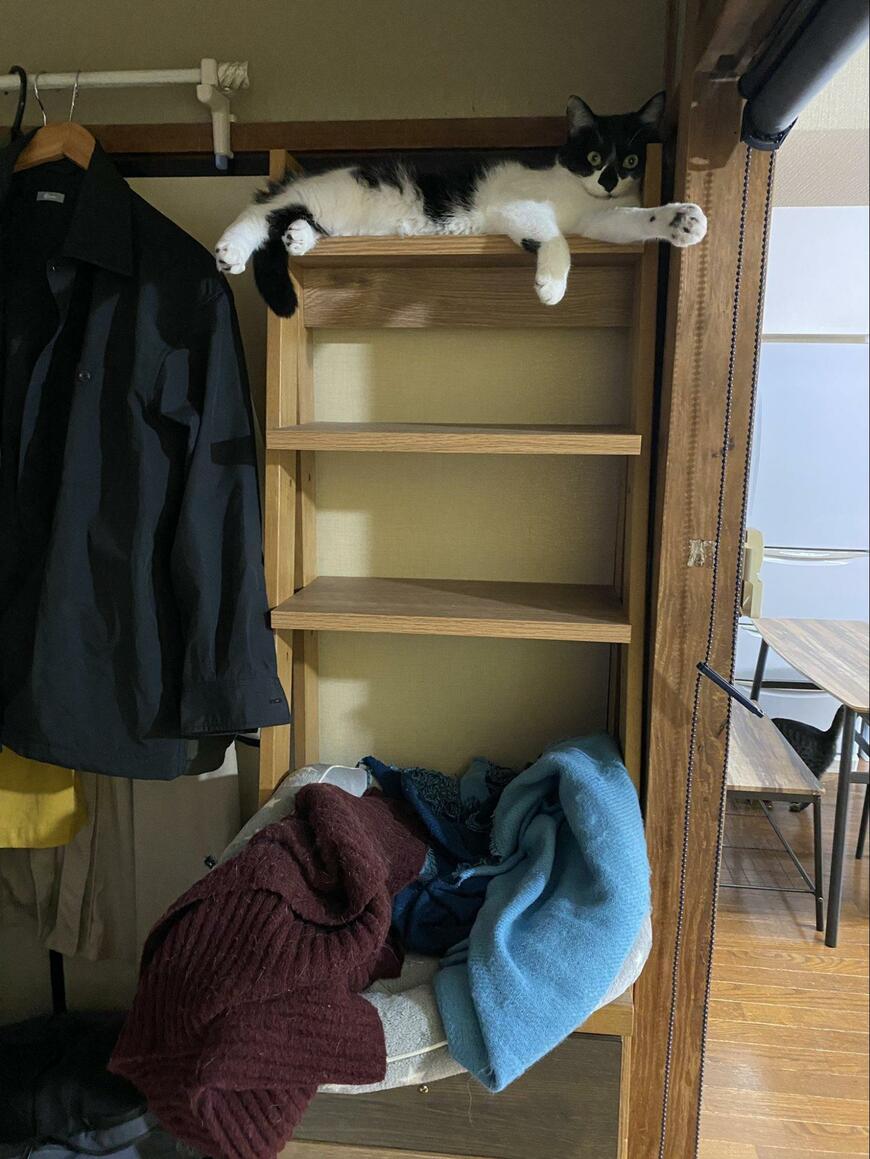 そこに写っているのは、棚でくつろぐハチワレ猫の「モズク」ちゃん。棚の最下段の出っ張り部分には、猫ちゃん用のクッションと、ふかふかの毛布が置かれていました。