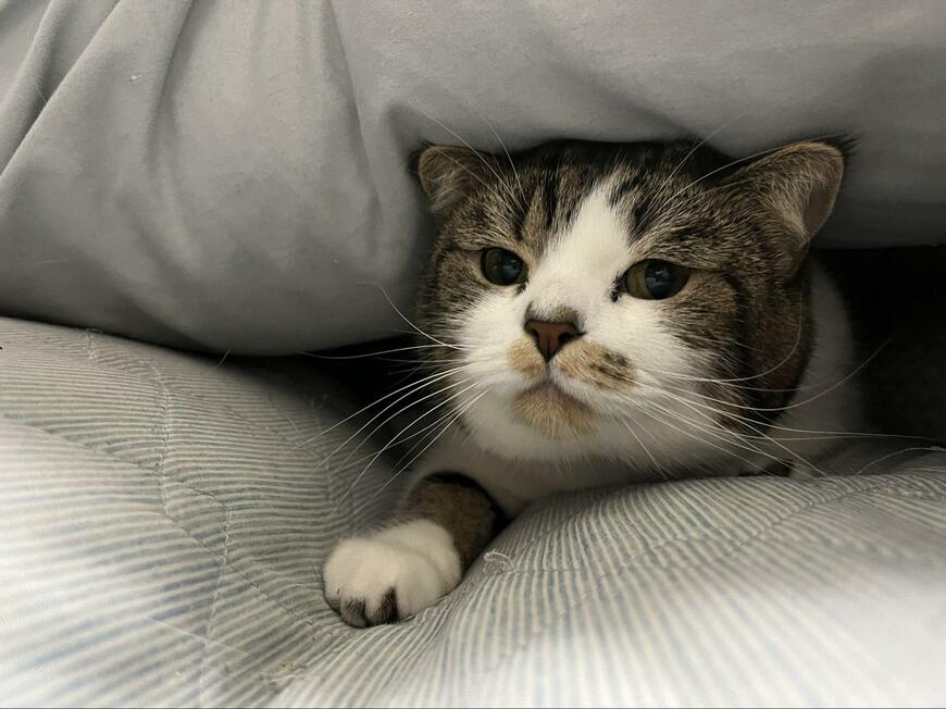 Xでたくさんの注目を浴びているのは、猫の「おにく」くん。眠そうな表情で、布団の中から視線を送っています。
