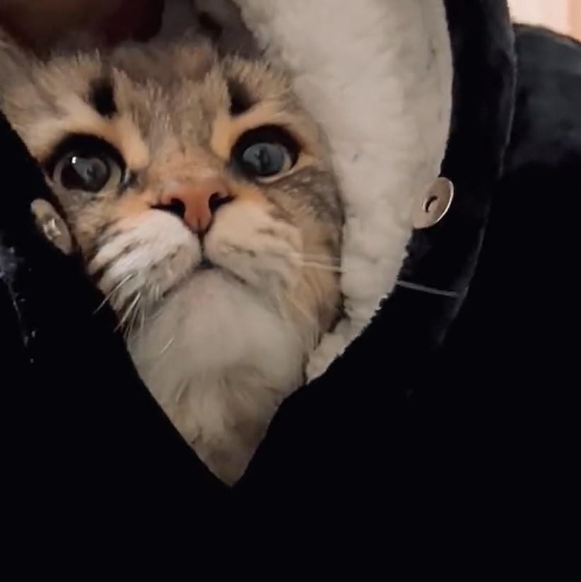 飼い主さんの胸元にスッポリとおさまり、隙間から顔を出すヤマネコくん。なんとも愛らしい姿に見入ってしまいます……。飼い主さんも猫ちゃんも非常に温かそうです。