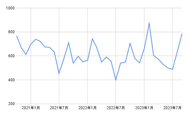 なお、全都市の小売価格の平均は707円(2023年9月時点)、前年同月比では+20%となっています(いずれも小数点第一位を四捨五入)。