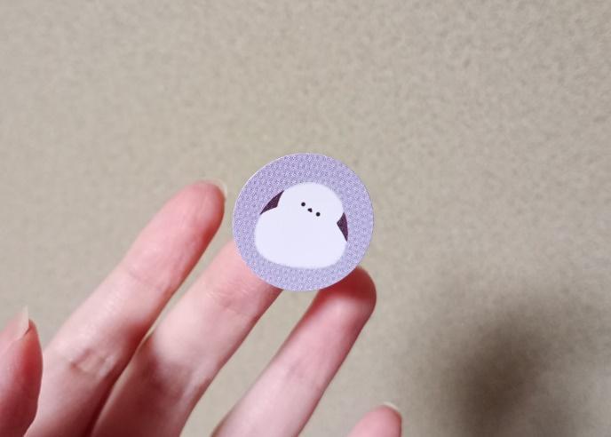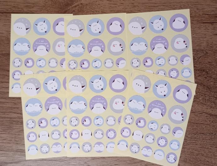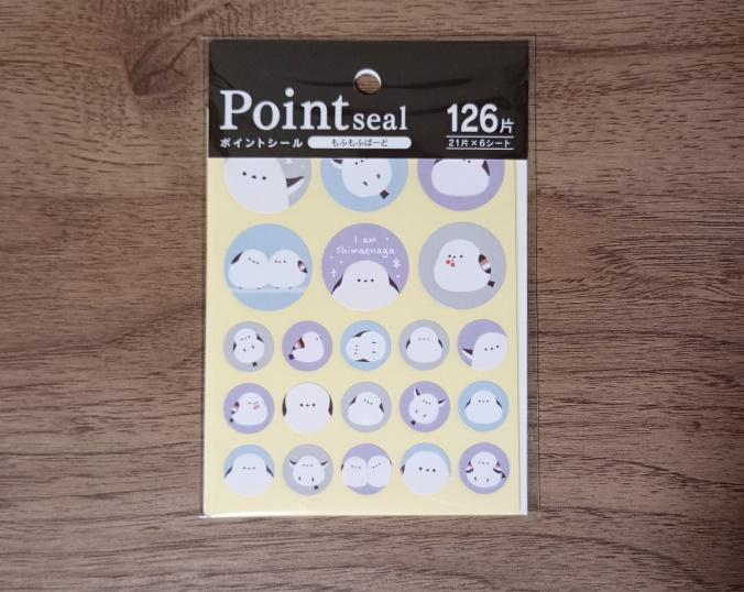 こちらは、「ポイントシール」です。円形のシールに、いろいろなポーズのシマエナガがプリントされています。上段の6個は直径26mm、下半分の15個は15mmです。