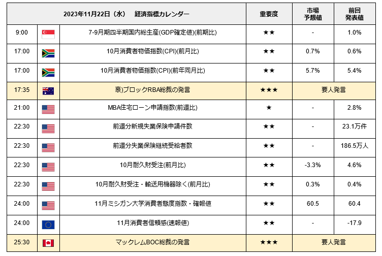 2023年11月22日(水)発表予定の経済指標カレンダーです。