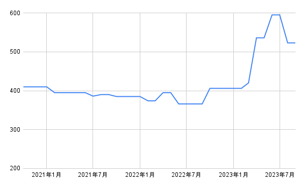 なお、全都市の小売価格の平均は514円(2023年9月時点)、前年同月比では+10%となっています(いずれも小数点第一位を四捨五入)。