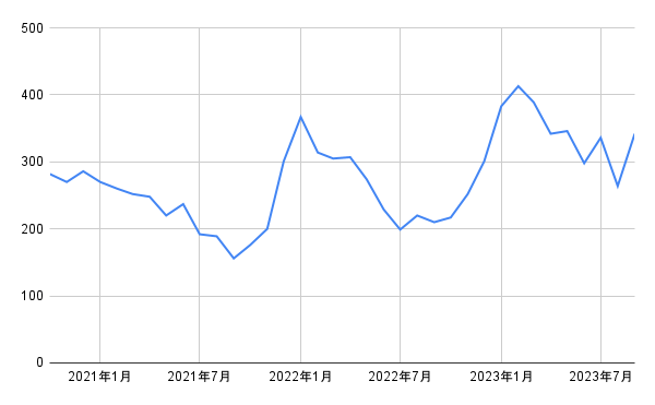 なお、全都市の小売価格の平均は330円(2023年9月時点)、前年同月比では+7%となっています(いずれも小数点第一位を四捨五入)。