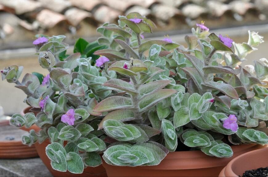 シラゲツユクサは観葉植物として人気の「トラディスカンティア」の一種。葉には白い毛が生え、夏から秋にかけて淡い紫色の花を先端に咲かせます。