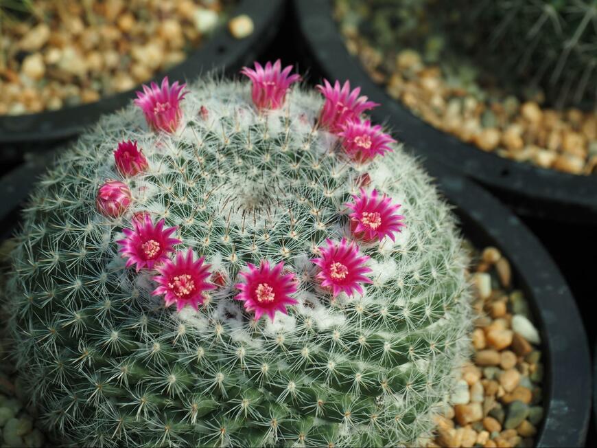 サボテンの一種でコロンとしたフォルムがキュートなマミラリア。トゲは柔らかくふわふわしているので、一般的なサボテンと異なり触っても痛くはありません。