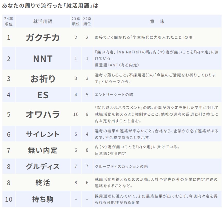 マイナビが24卒の学生モニターを対象に「あなたの周りで流行った就活用語」のアンケートを実施しました。そのランキング結果をみていきましょう。