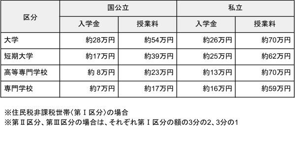 入学金や授業料の減免も、以下のように進学先などにより異なります。