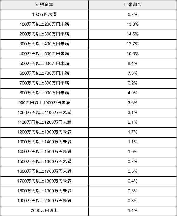 参考までに、各所得ごとの世帯割合を下表にまとめましたのでご覧ください。
