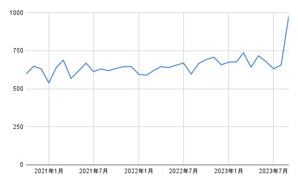 なお、全都市の小売価格の平均は759円(2023年9月時点)、前年同月比では+11%となっています(いずれも小数点第一位を四捨五入)。
