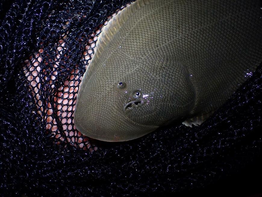 そこに収められていたのは、平たい体が特徴のカレイ目の魚・シタビラメ。黒っぽい体には、なんとも不気味な顔が浮かんでいます。
