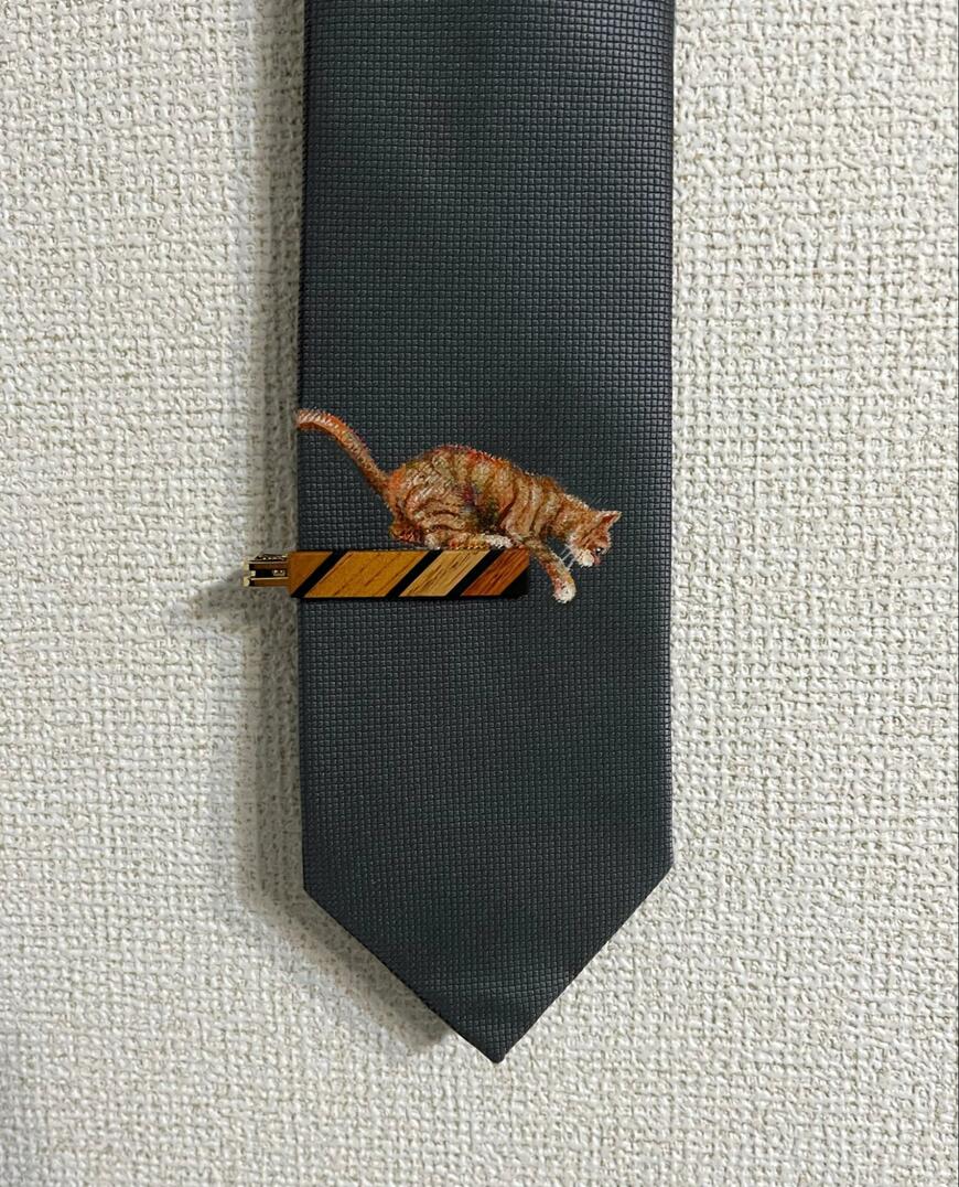 『ネクタイに、「ネクタイピンから飛び降りようとしている猫」を描きました。』そんなコメントとともに投稿されたのは、1枚の写真でした。