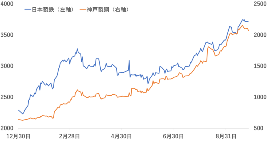 日本製鉄と神戸製鋼の株価の年初来から9月までの推移は次の通りです。