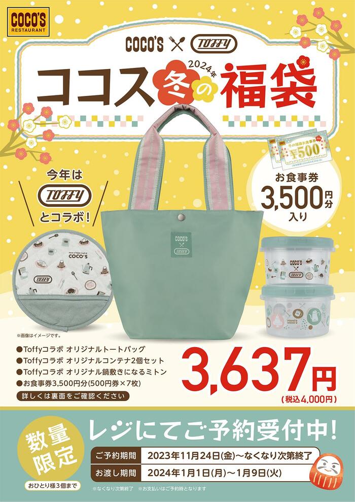福袋はココスの店頭にて予約を受付し、なくなり次第終了とのこと。お渡し期間は2024年1月1日(月)から1月9日(火)で、価格は税込4000円です。お食事券3500円入りなので、お得さもバッチリですね。