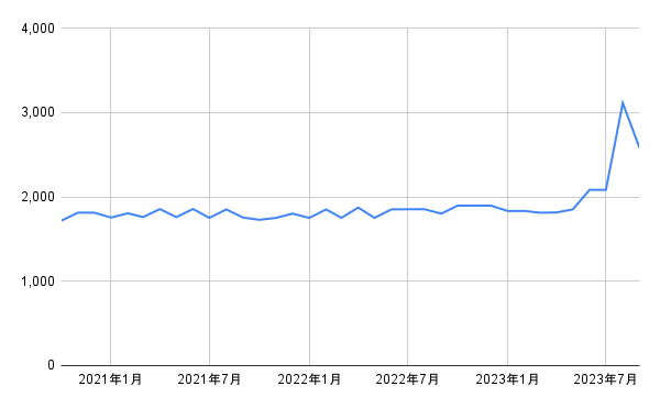 なお、全都市の小売価格の平均は2620円(2023年9月時点)、前年同月比では+8%となっています(いずれも小数点第一位を四捨五入)。
