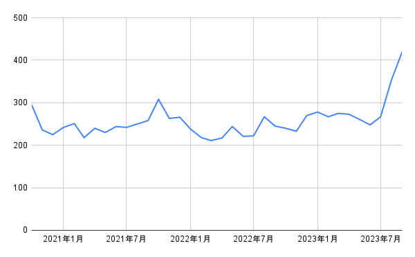 なお、全都市の小売価格の平均は332円(2023年9月時点)、前年同月比では+13%となっています(いずれも小数点第一位を四捨五入)。