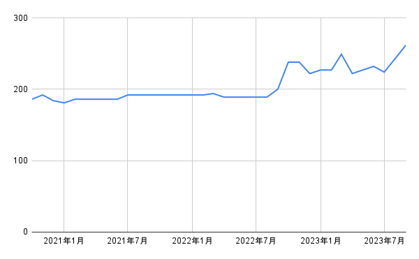 なお、全都市の小売価格の平均は251円(2023年9月時点)、前年同月比では+16%となっています(いずれも小数点第一位を四捨五入)。