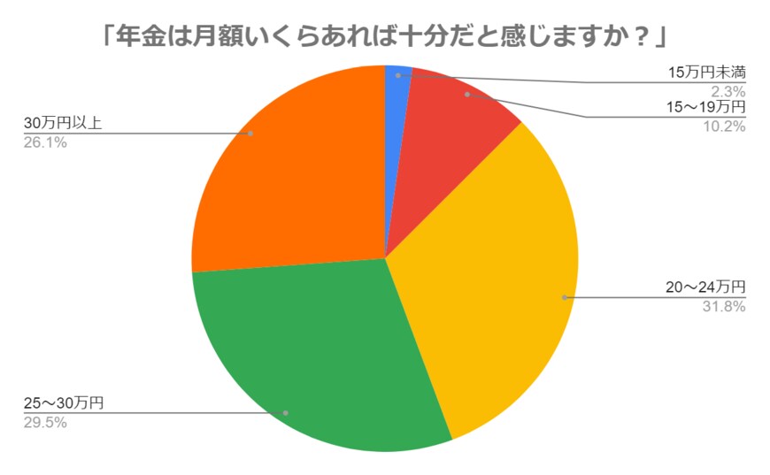 続いて、「年金は月額いくらあれば十分だと感じますか?」という問に対し、「20~24万円」(31.8%)と答える方が一番多い結果になりました。