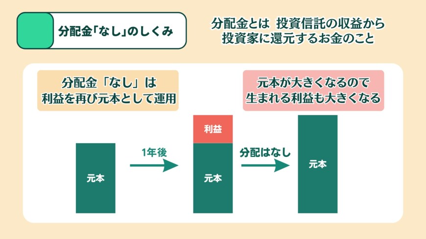 分配金があるタイプは運用益をその都度得られるのがメリットですが、分配金がないタイプは、分配金が投資家に支払われず再投資されるので、複利効果によって収益性が高くなるメリットがあります。