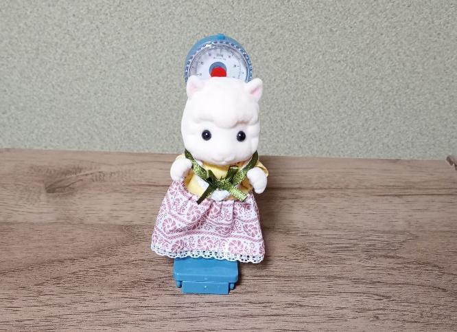 シルバニアファミリーのアルパカのお母さんをのせてみました。シルバニアは、横幅があるので、土台部分がやや小さいように見えます。