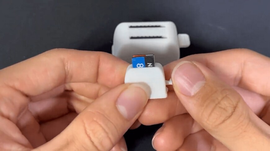 さきほどのSDカードホルダーよりさらにミニチュアながら、カードが飛び出す仕様もそのままです。こんなにも小さくて精密なものまで作れるとは、3Dプリンターの技術の高さに驚いてしまいますね。